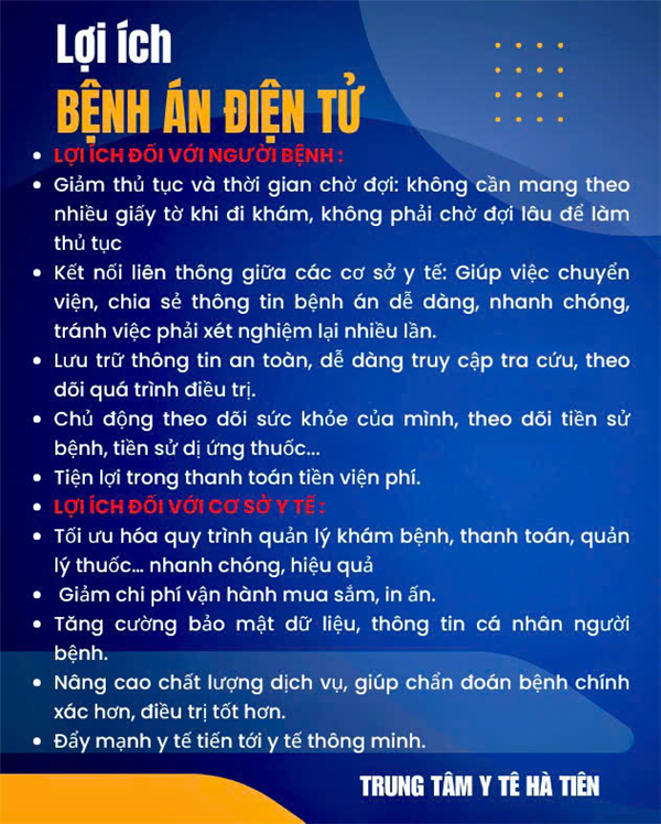 Để chuẩn bị tốt cho công tác triển khai thực hiện Bệnh án điện tử, Trung tâm Y tế Hà Tiên đã xây dựng dự toán đầu tư trang thiết bị, hạ tầng công nghệ thông tin, mua sắm phần mềm, thiết bị phục vụ lấy số, quét mã vạch, đưa nhân viên đi tập huấn học hỏi kinh nghiệm từ đơn vị đã triển khai thực hiện tốt bệnh án điện tử.